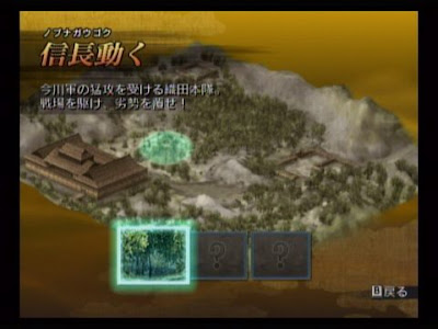進入故事模式後可見有四個章節,目前只能第一個,選立身之章後,裡面有五個戰役,當然也只能選第一個。桶狹間之戰分為三個部分,可以把他看成是checkpoint,每完成一個部分就會自動存檔。